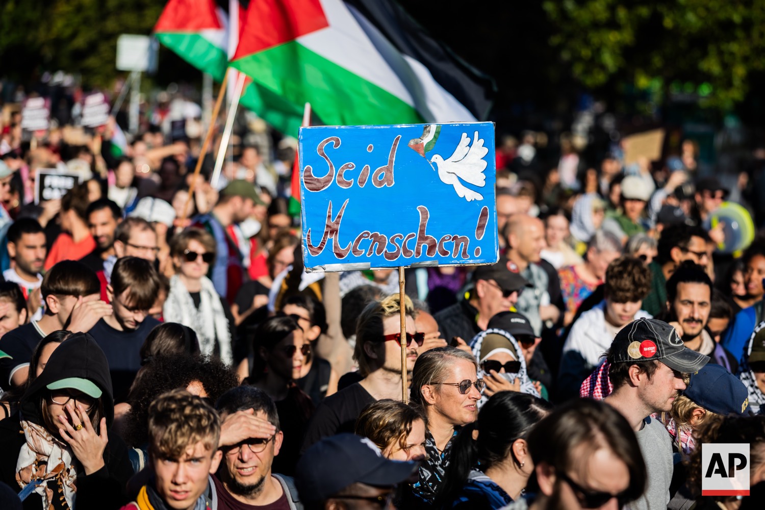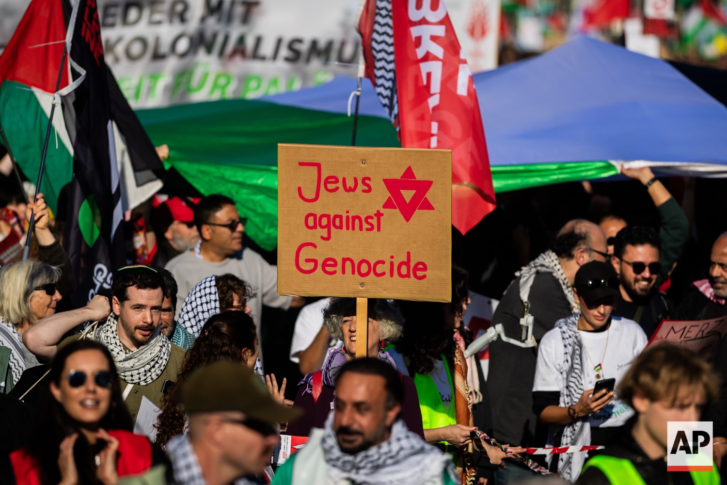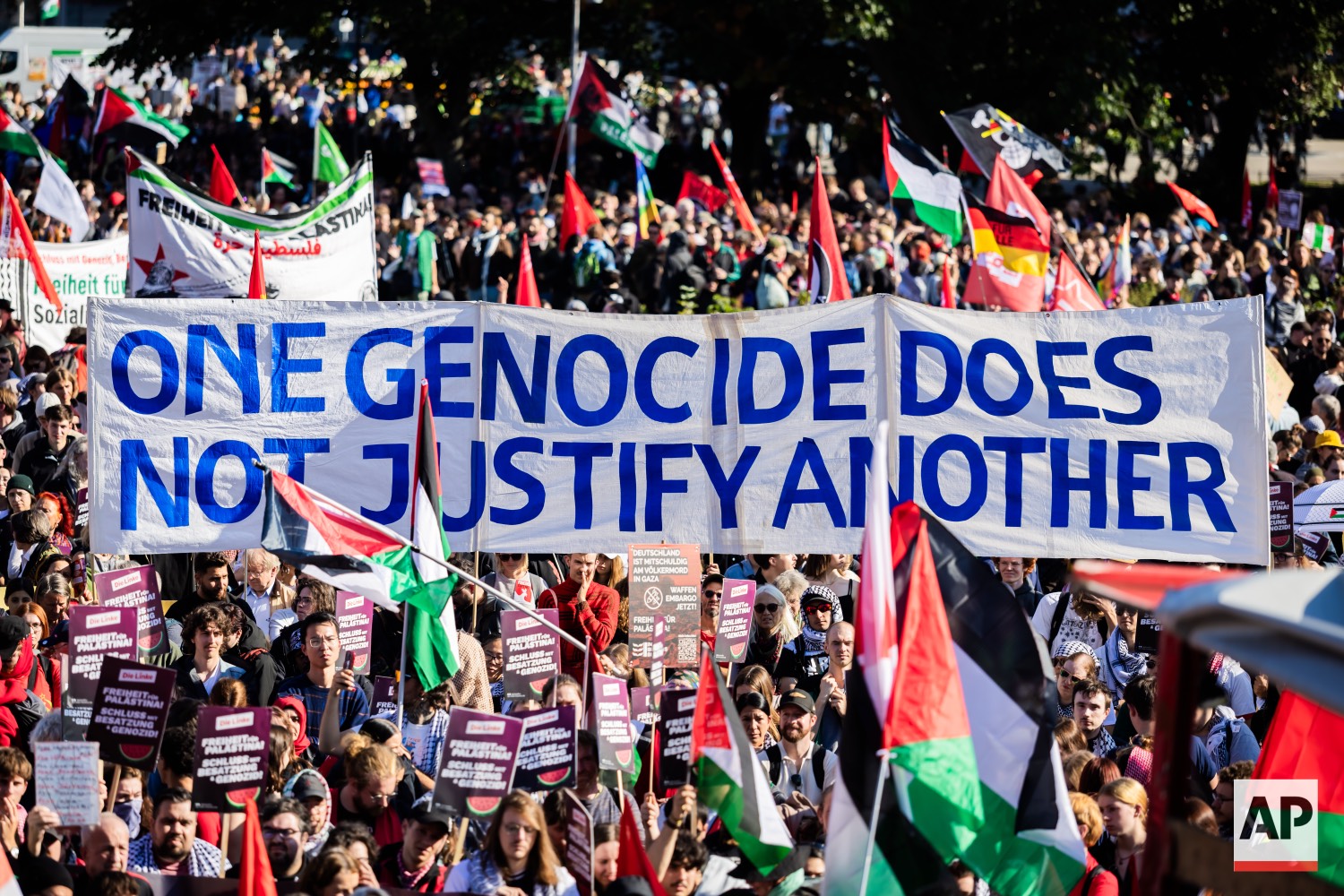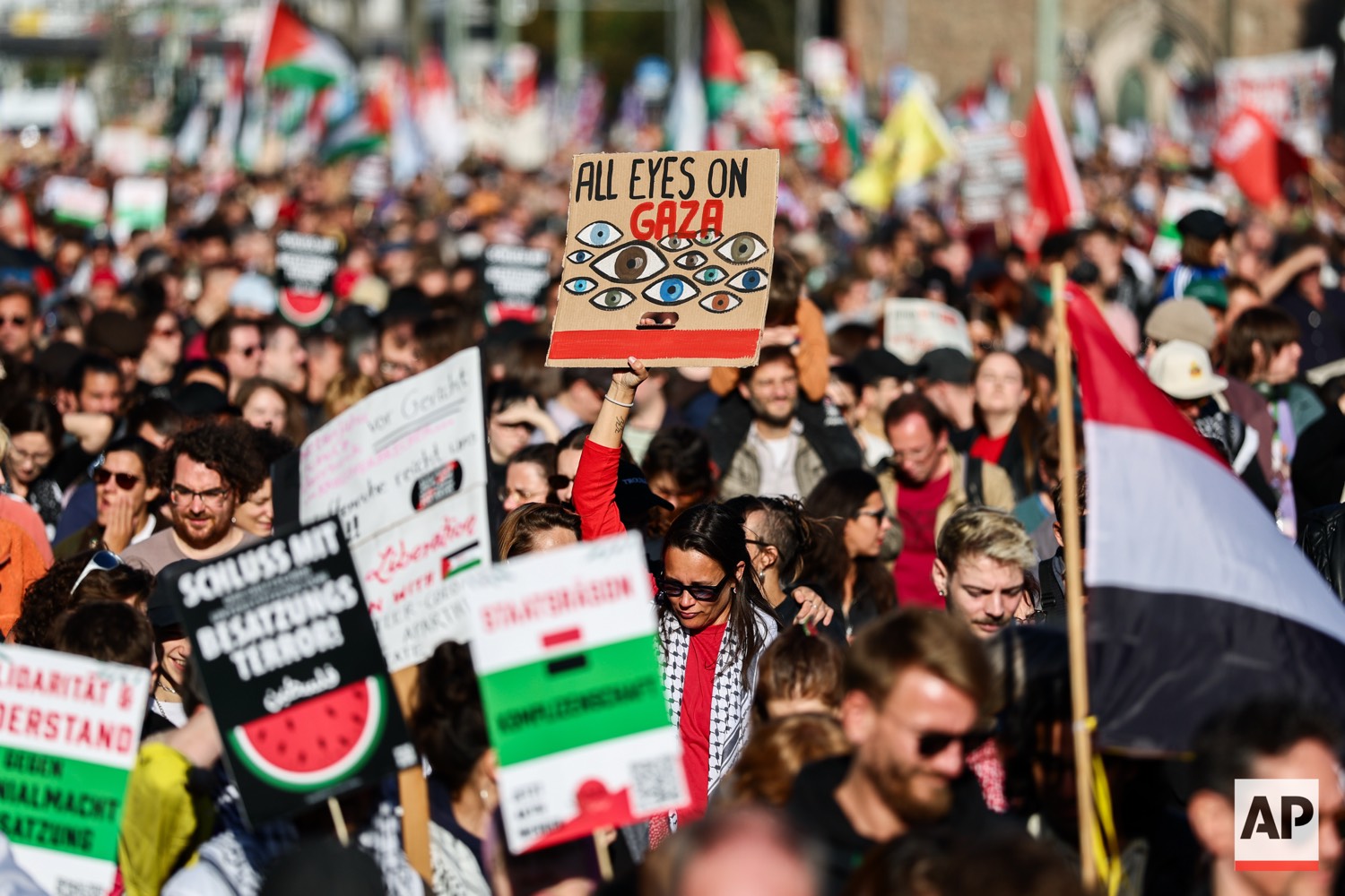 People protest against Israel during a mass demonstration called “All Eyes on Gaza“ in support of Palestinians in Berlin, Germany, Saturday, Sept. 27, 2025. (AP Photo/Christoph Soeder)