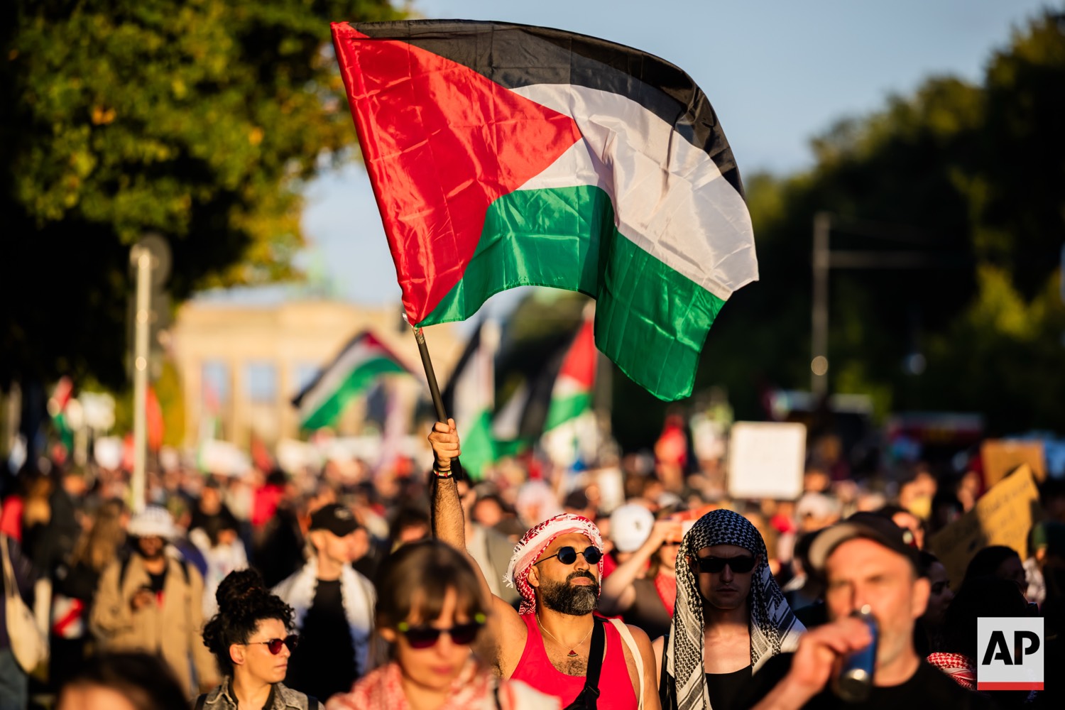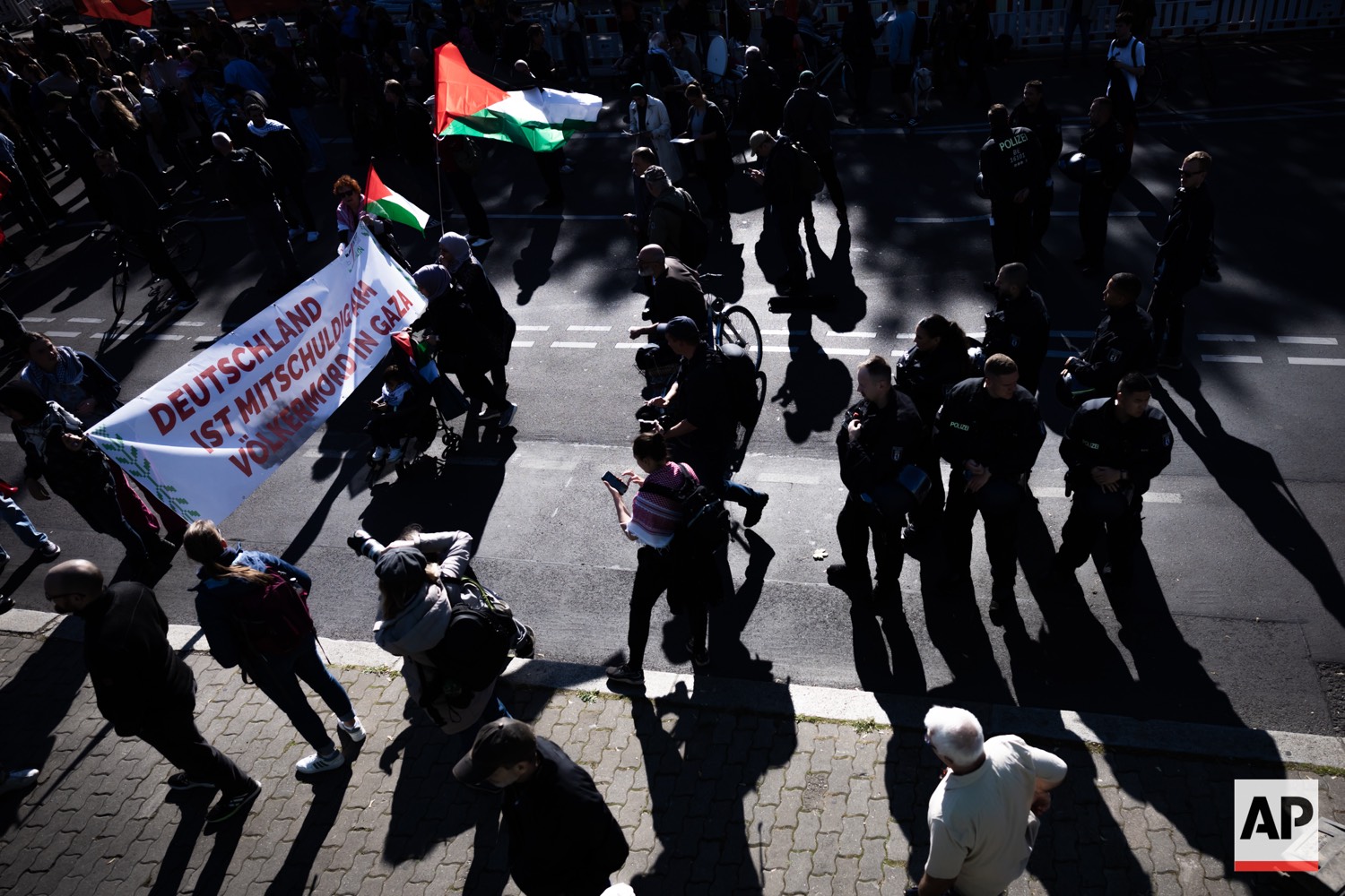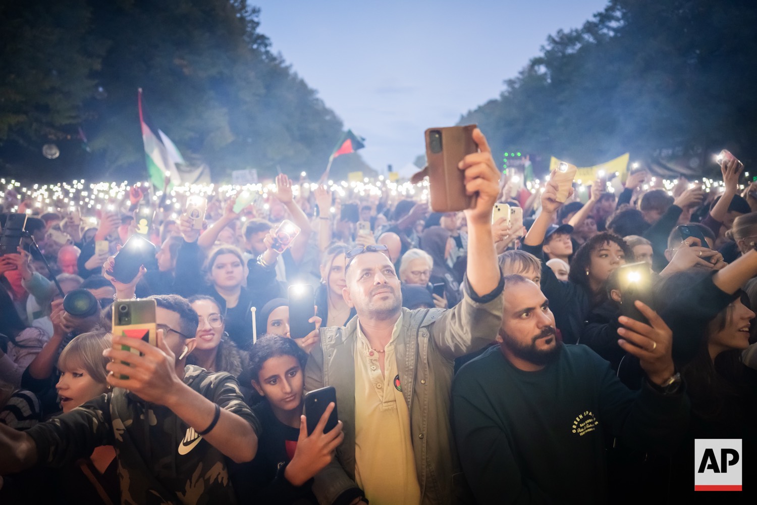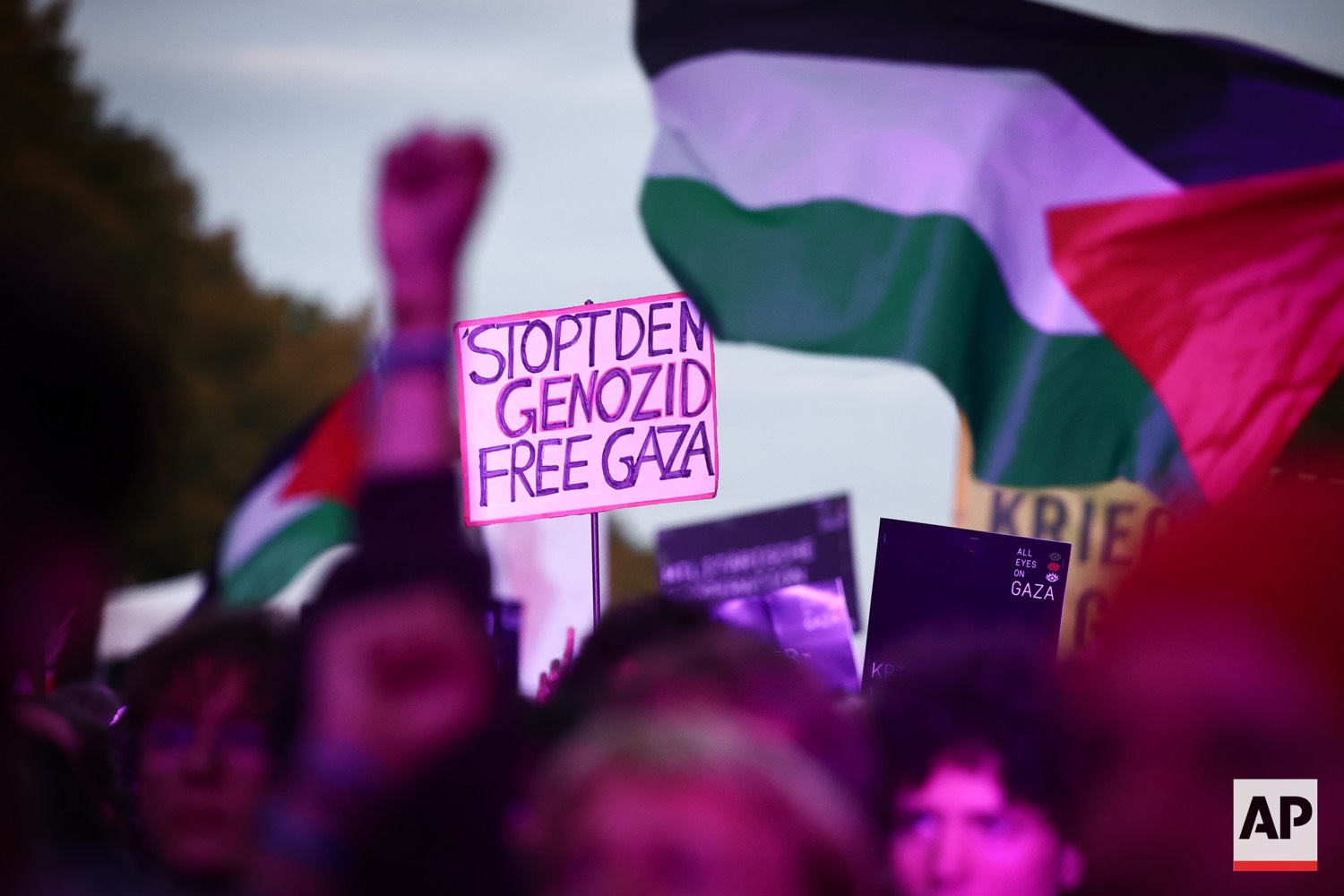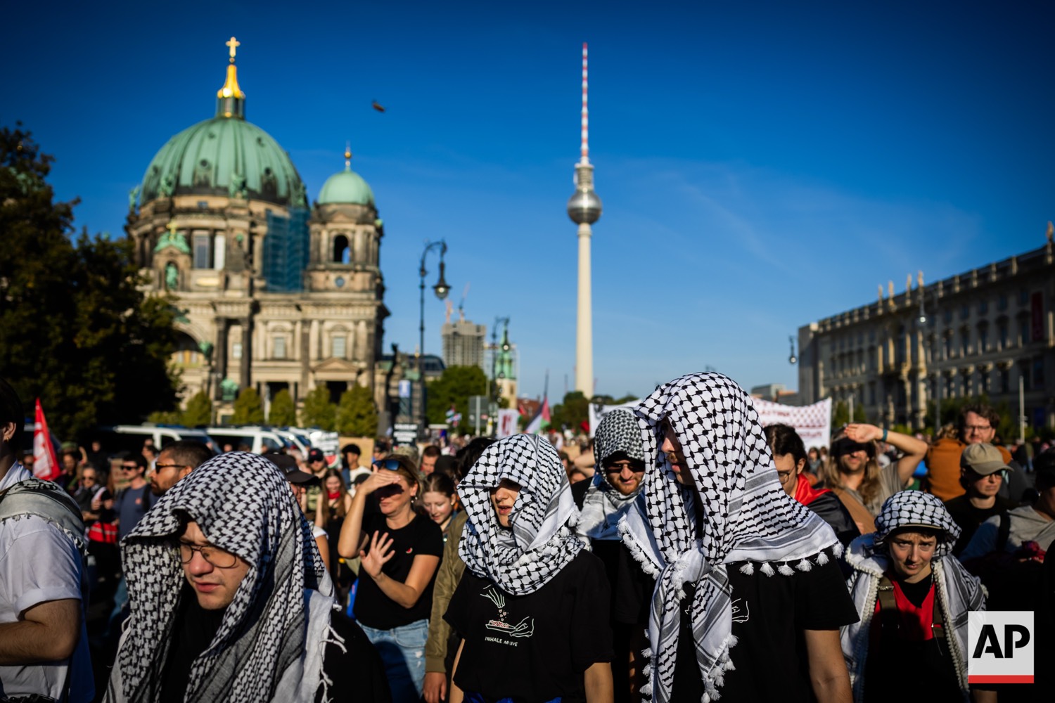 People protest against Israel during a mass demonstration called “All Eyes on Gaza“ in support of Palestinians in Berlin, Germany, Saturday, Sept. 27, 2025. (AP Photo/Christoph Soeder)