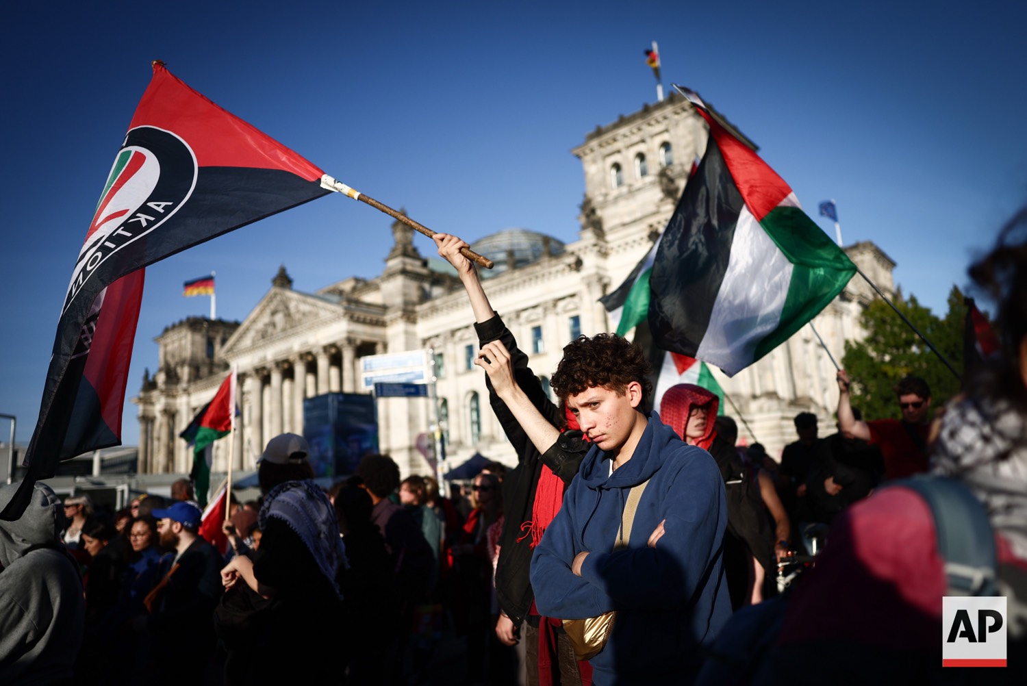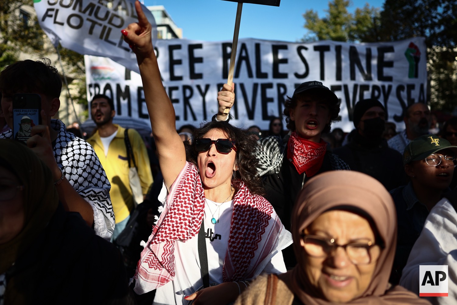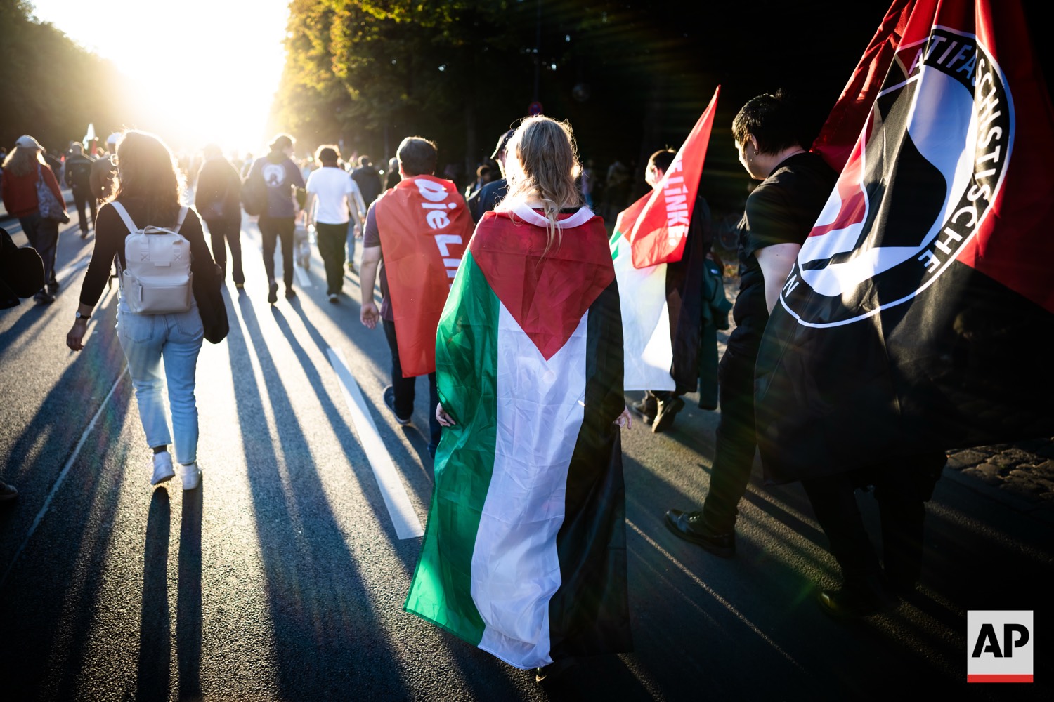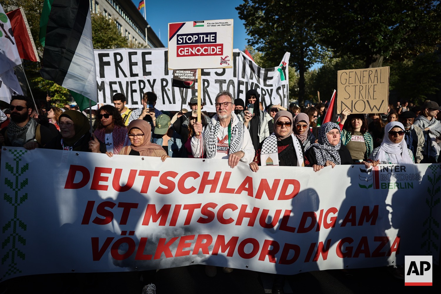 People protest against Israel during a mass demonstration called “All Eyes on Gaza“ in support of Palestinians in Berlin, Germany, Saturday, Sept. 27, 2025. (AP Photo/Christoph Soeder)