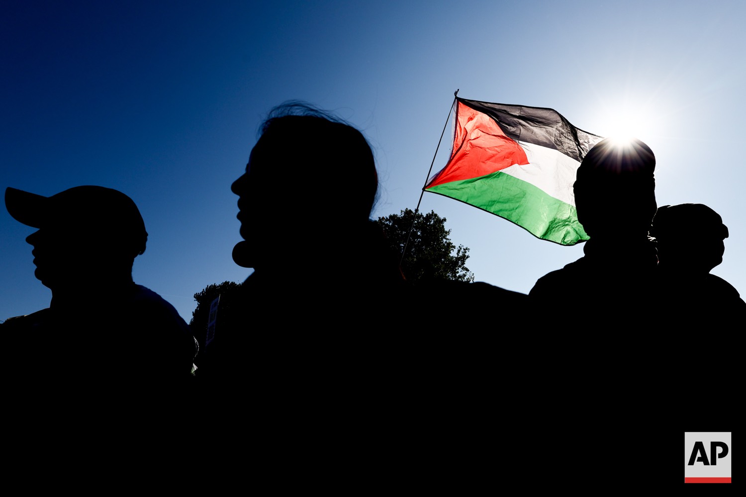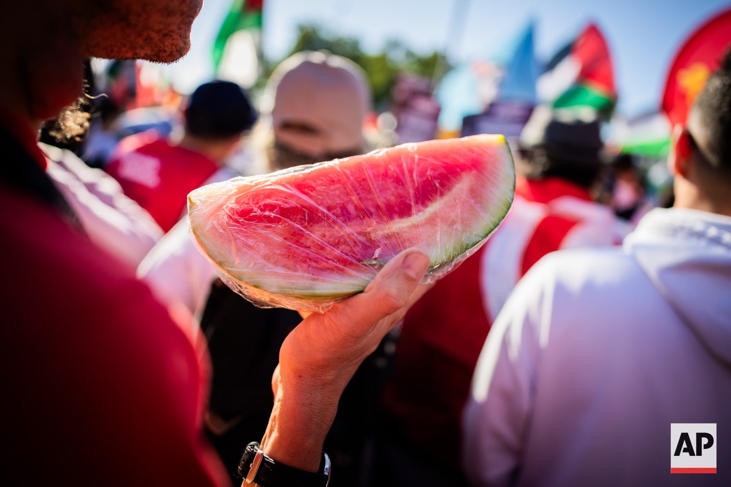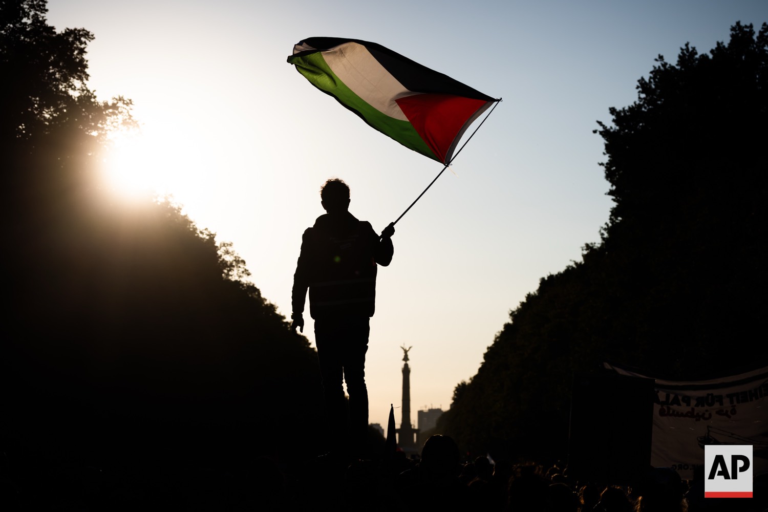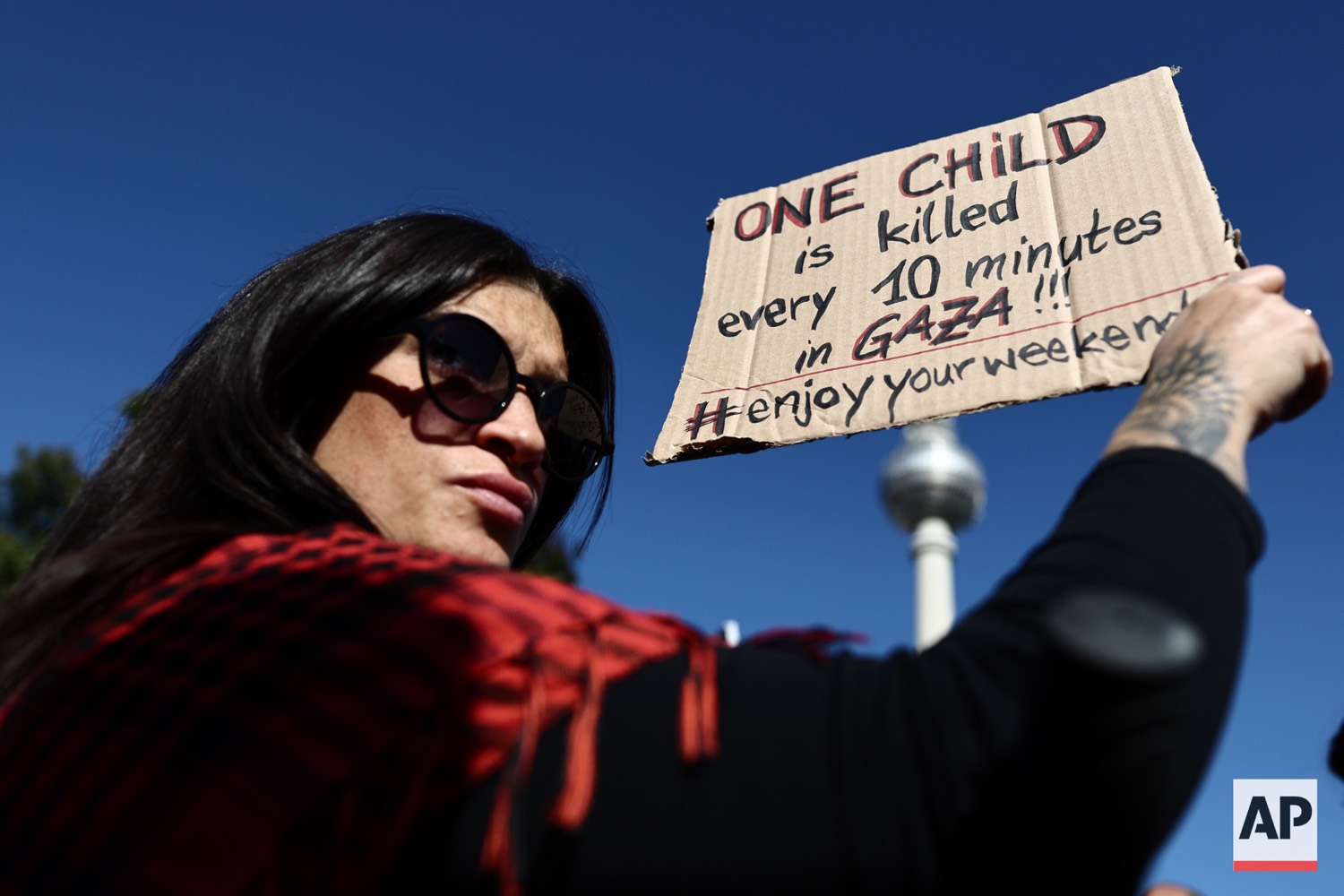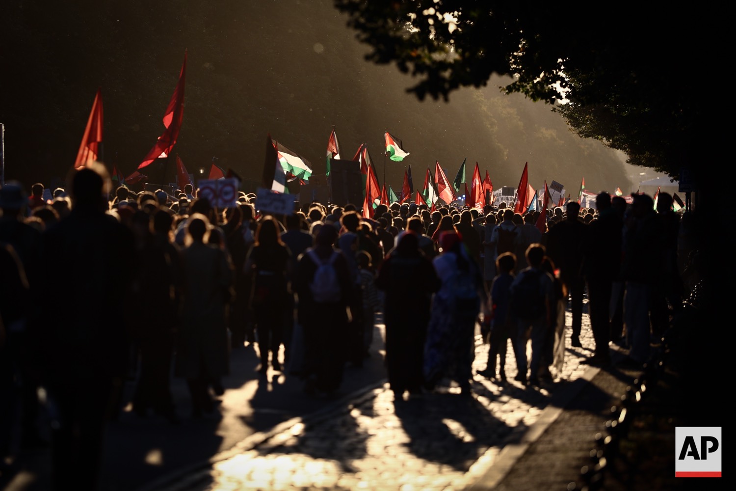 People protest against Israel during a mass demonstration called “All Eyes on Gaza“ in support of Palestinians in Berlin, Germany, Saturday, Sept. 27, 2025. (AP Photo/Christoph Soeder)