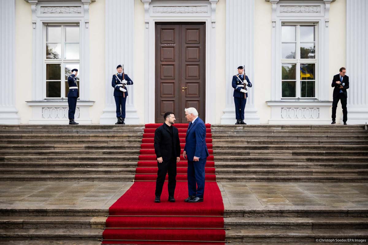 German President Frank-Walter Steinmeier (r) welcomes Ukrainian President Wolodymyr Selenskyj.