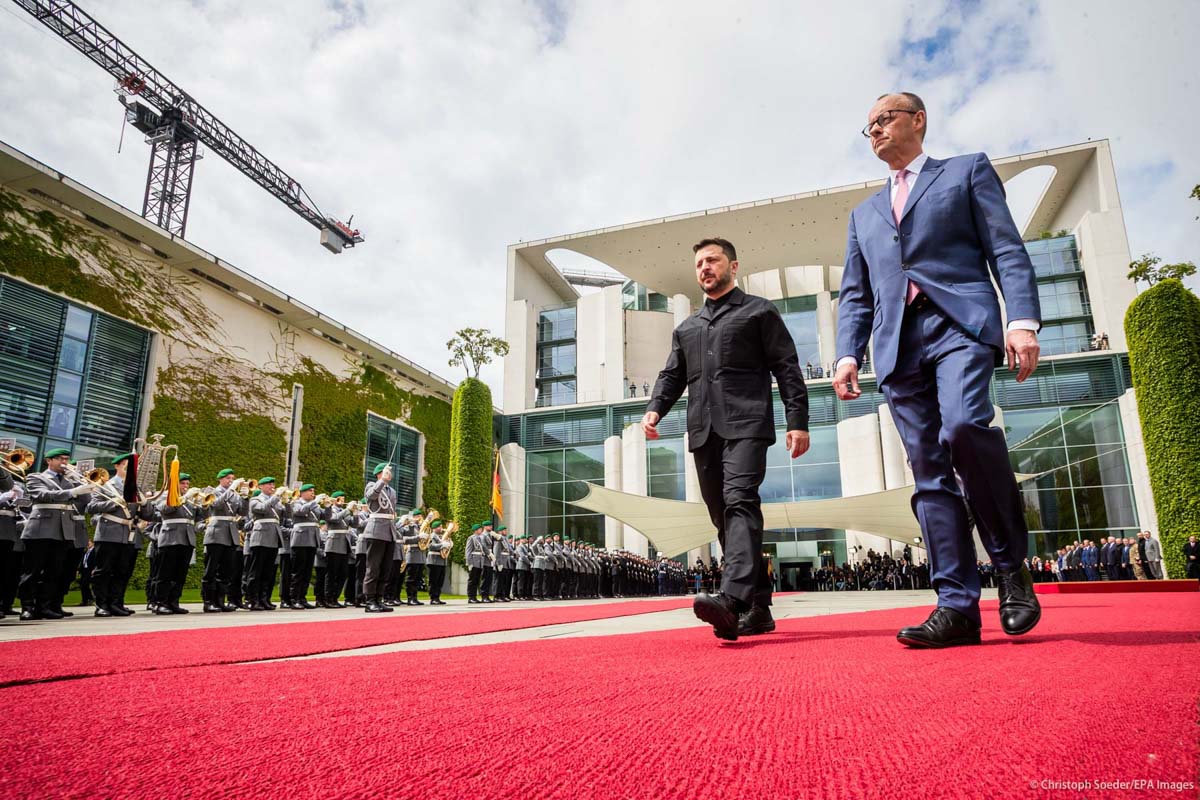 German Chancellor Friedrich Merz (r) welcomes Ukrainian President Wolodymyr Selenskyj (c) with military honors at the Chancellery.