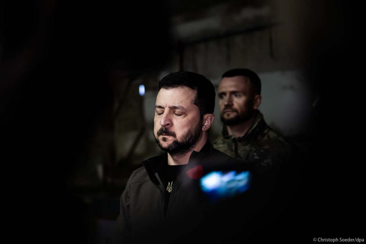 Ukrainian President Wolodymyr Selenskyj stands in a school basement where civilians were forcibly kept as human shield by Russian occupiers.