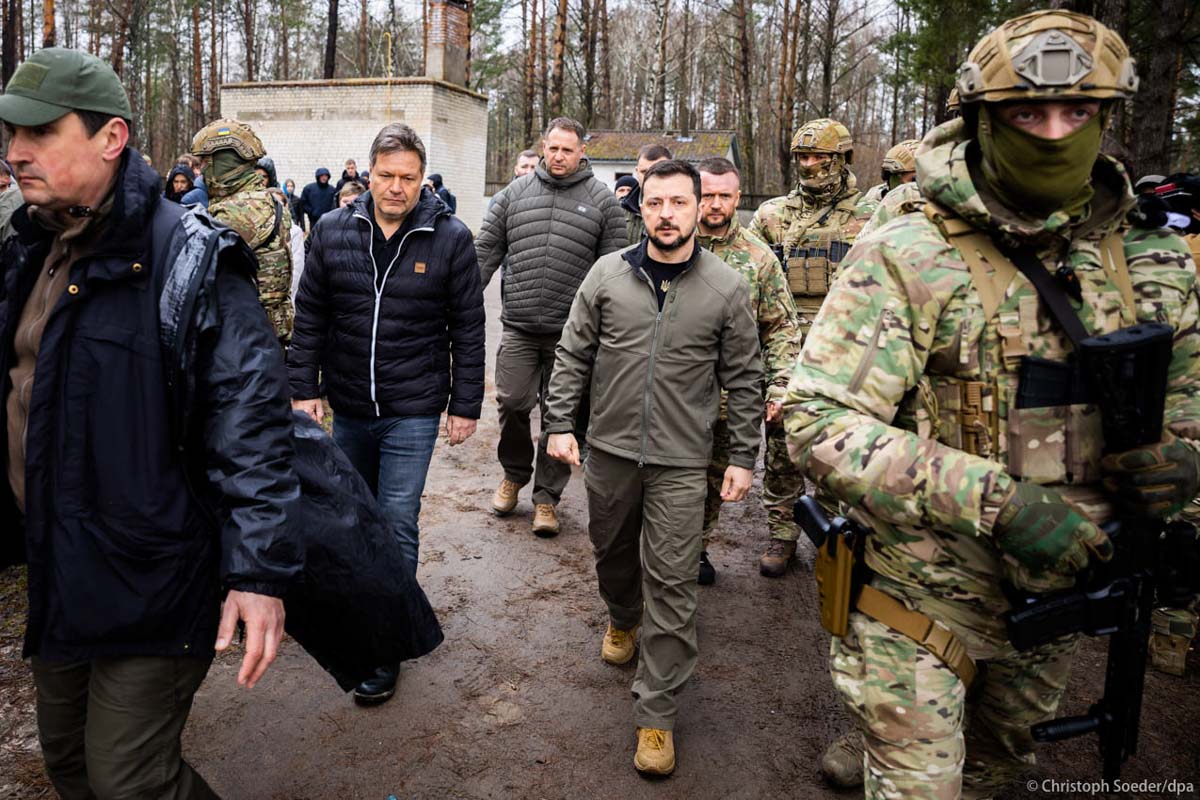 Ukrainian President Wolodymyr Selenskyj (r) and German economy and climate minister Robert Habeck (l) leave the village.