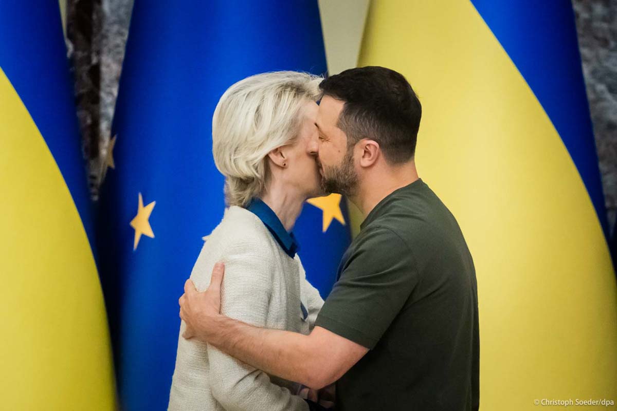 Ursula von der Leyen, President of the European Commission, and Ukrainian President Wolodymyr Selenskyj hug following a joint press conference in Kyiv, Ukraine.