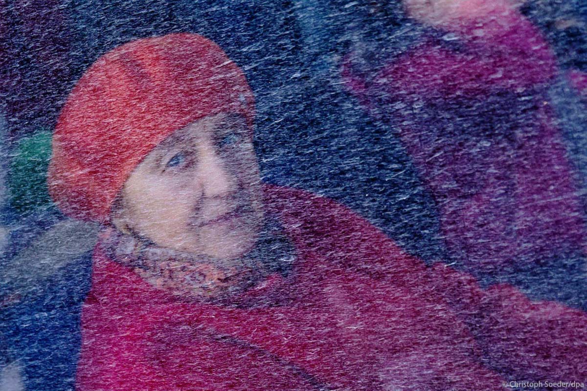 A woman is seen inside a bus behind a dirty window at the border crossing between Poland and Ukraine in Medyka. She waits to be transferred to the close-by Polish city Przemysl.