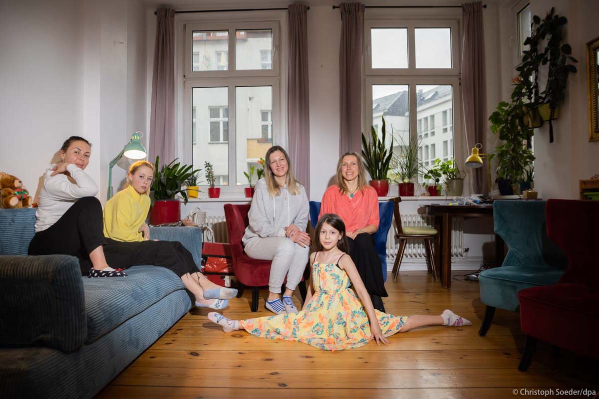 Hostess Monika (r) helps Elina (2nd from right) doing acrobatics as she sits with Kateryna (l) and her daughter Daria (2nd from left) and Elina’s mother Tanya (3rd from left) in the guest room, which used to be the living room. Both mothers are friends and fled together in mid-March from the city of Kremenchuk, located around 300km south-east of Kyiv. Their husbands drove them to the Polish border, from where they fled to Berlin and found their hostess Monika through a website that arranges private accommodation for refugees from Ukraine. Monika then picked her up directly at Berlin Central Station. The girls Elina and Daria are taking part in online lessons provided from home and will attend school in Berlin as soon as possible, says Monika, who has two children herself and works in educational counseling. Tanya, who worked in chemical laboratory, had to leave her 18-year-old son back home, who is not allowed to leave the country. With tears in her eyes, she says, that it is be very unlikely however, for him to be asked to serve in the army, as he has no fighting experience.
