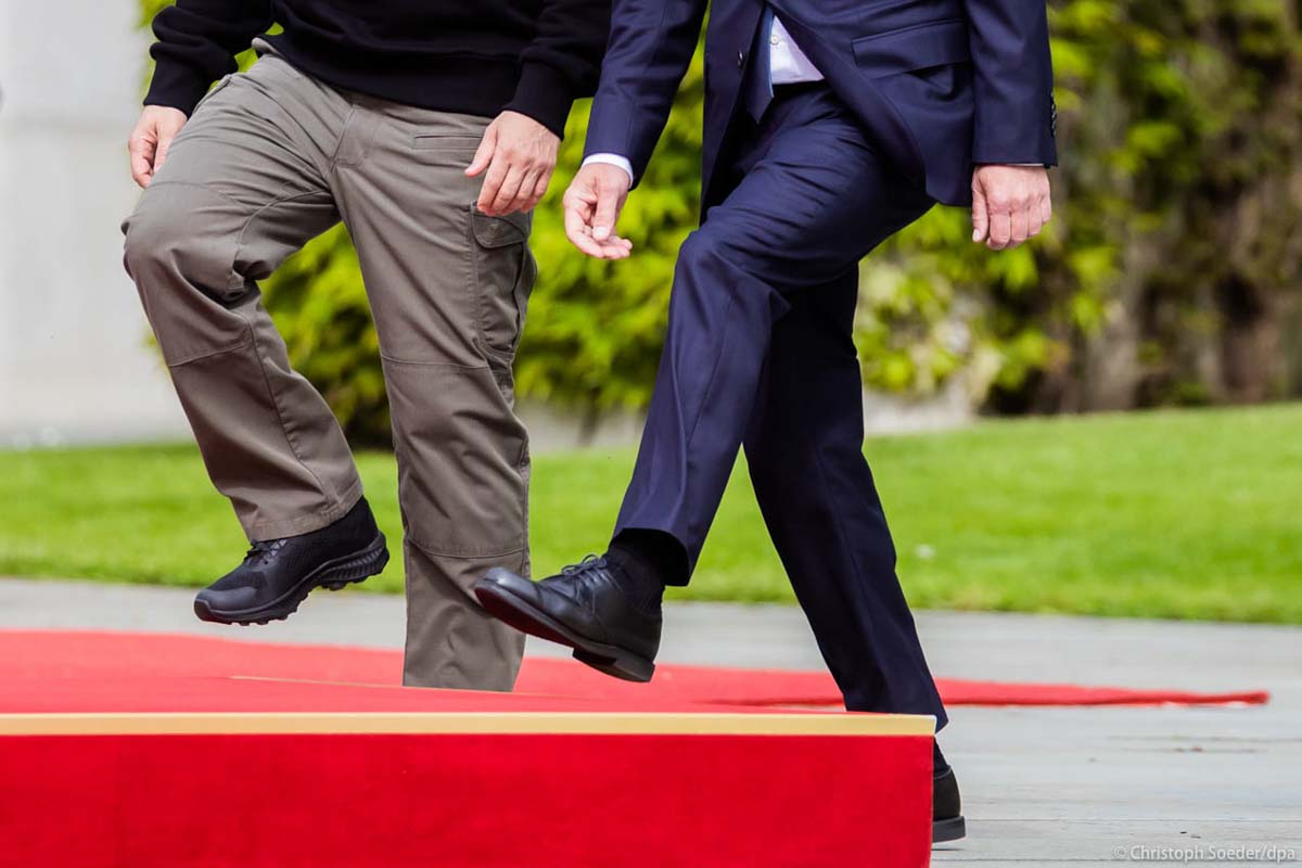 Ukrainian President Wolodymyr Selenskyj (l) is received by German Chancellor Olaf Scholz with military honors at the chancellery in Berlin.