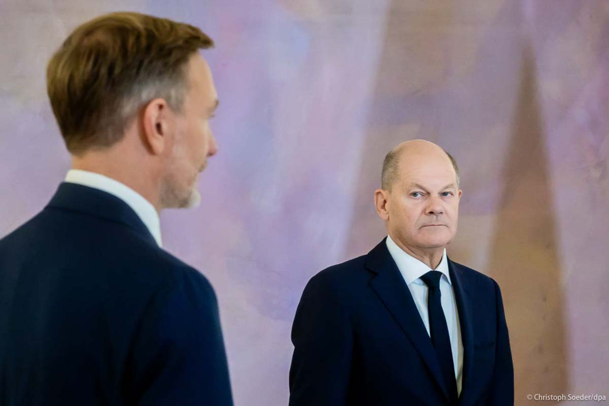 German Chancellor Olaf Scholz (r) looks at dismissed German Finance minister Christian Lindner during a dismissal ceremony for FDP ministers at Bellevue Palace.