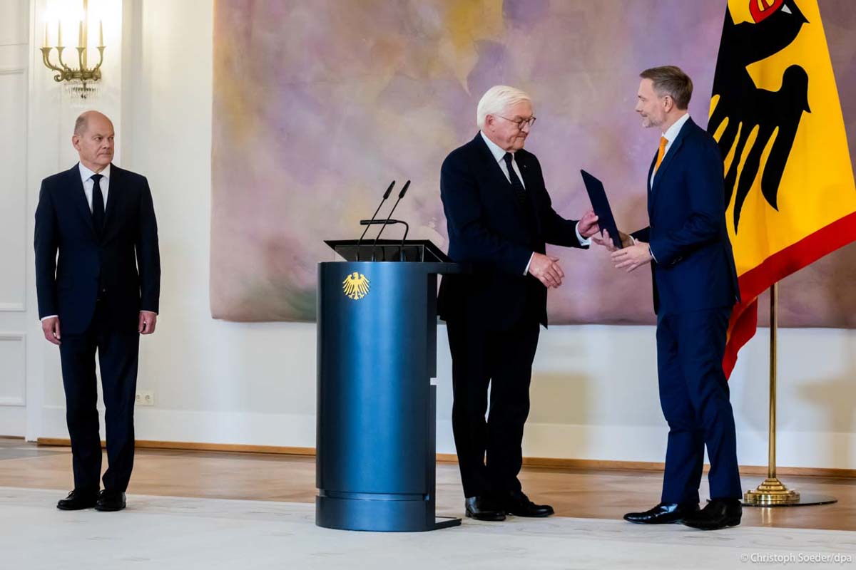 German President Frank-Walter Steinmeier (c) dismisses Finance minister Christian Lindner (r) during a dismissal ceremony for FDP ministers at Bellevue Palace in the presence of German Chancellor Olaf Scholz (l).