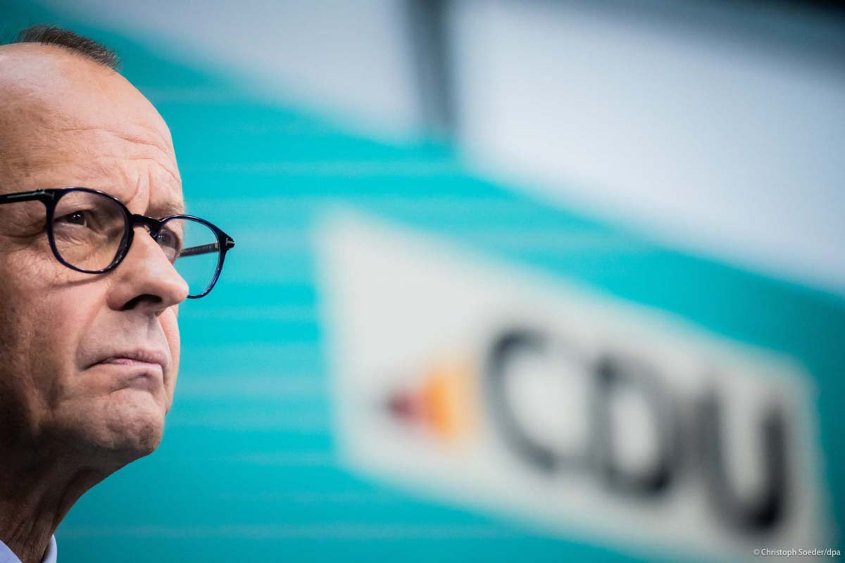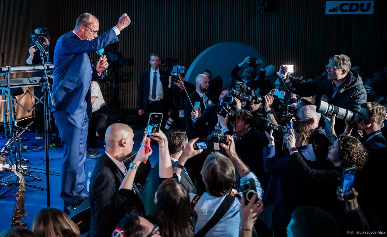 Candidate of the mainstream conservative Christian Democratic Union party Friedrich Merz (c) at the election party at CDU-headquarters in Berlin