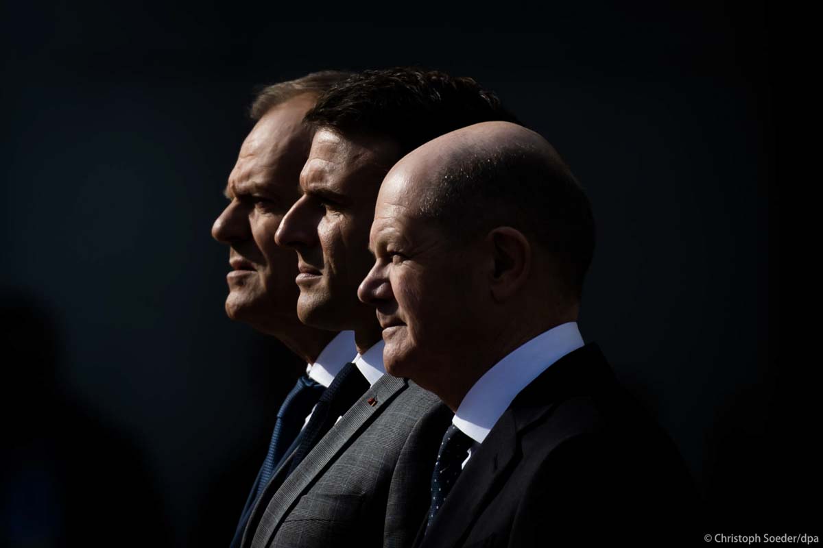 German Chancellor Olaf Scholz (r) receives French President Emmanuel Macron (c) and Poland's Prime Minister Donald Tusk (l) for the so-called Weimar Triangle talks at the chancellery.