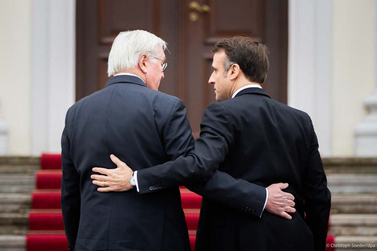 German President Frank-Walter Steinmeier and French President Emmanuel Macron meet at the Bellevue Palace ahead of their attendance of the act of mourning for Wolfgang Schaeuble.