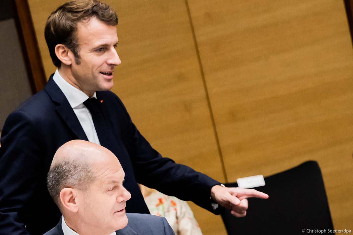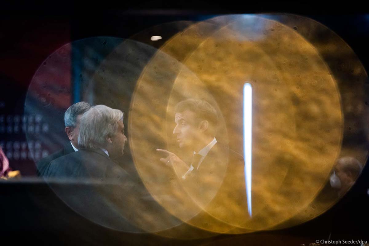 French President Emmanuel (top) Macron and German Chancellor Olaf Scholz attend a side event during the G20 summit.