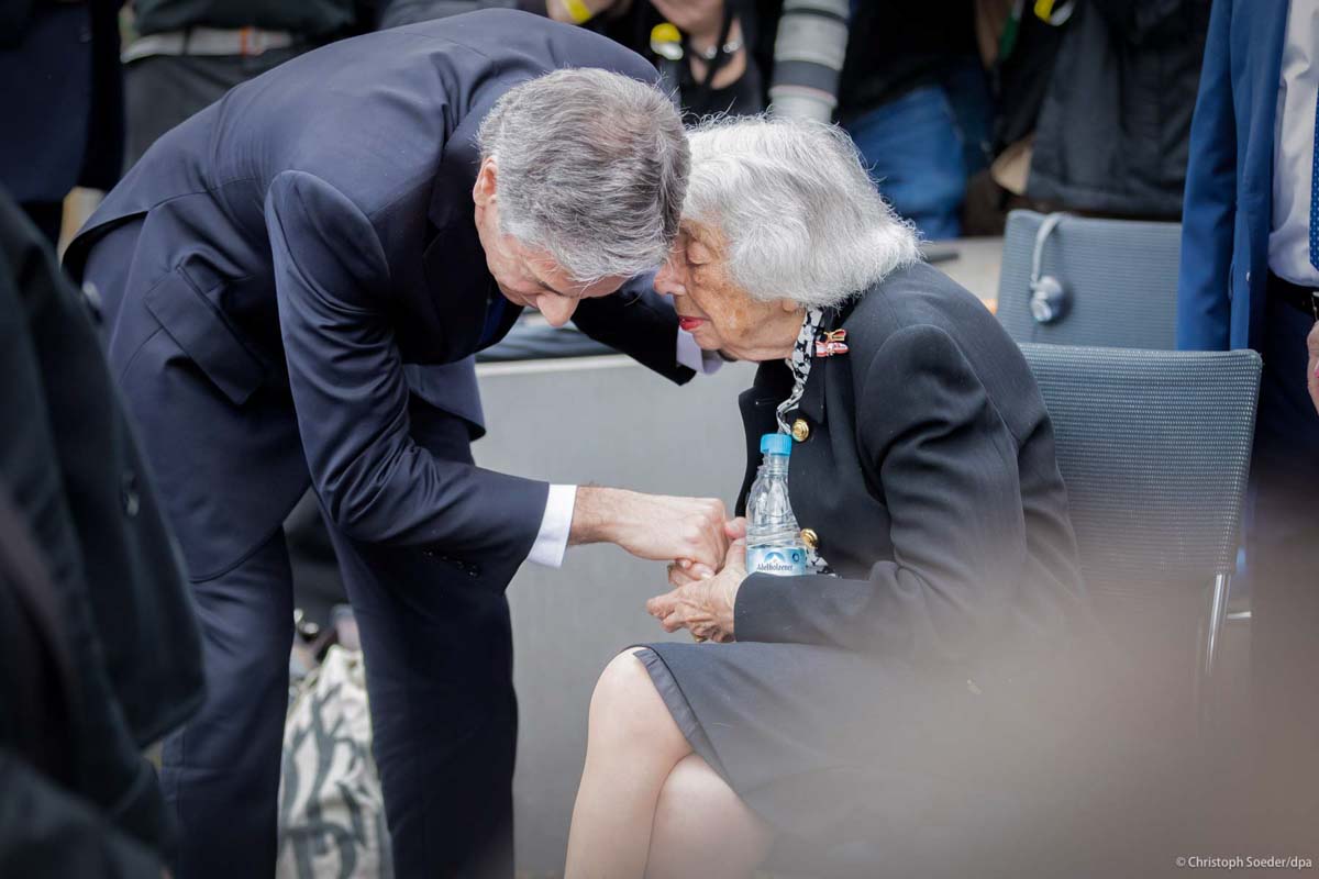 US Secretary of State Antony Blinken speaks with Holocaust survivor Margot Friedländer during a joint visit at the Holocaust Memorial.