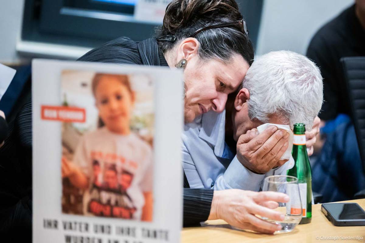 Yehiel Yehoud (r), Farther of hostage Dolev Yehud is being comforted by Efrat Machikawa, niece of hostage Gadi Moshe Mozes during a meeting with relatives of hostages who have been held captive by Hamas since October 7 and press members at the Israeli embassy.