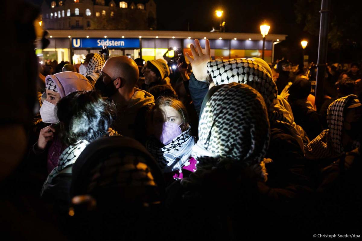 Swedish activist Greta Thunberg (c) attends a pro-Palestinian protest in Berlin at the occasion of the first anniversary of the Hamas attack on Israel on 7th October 2023.