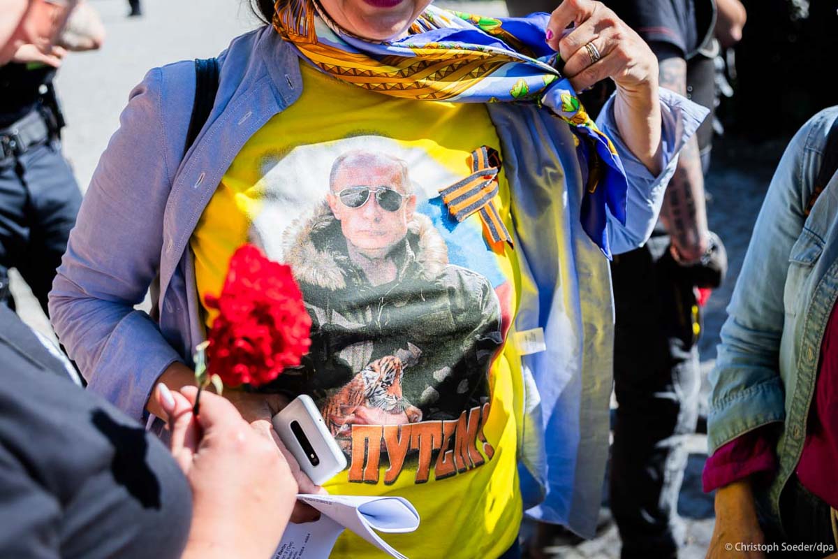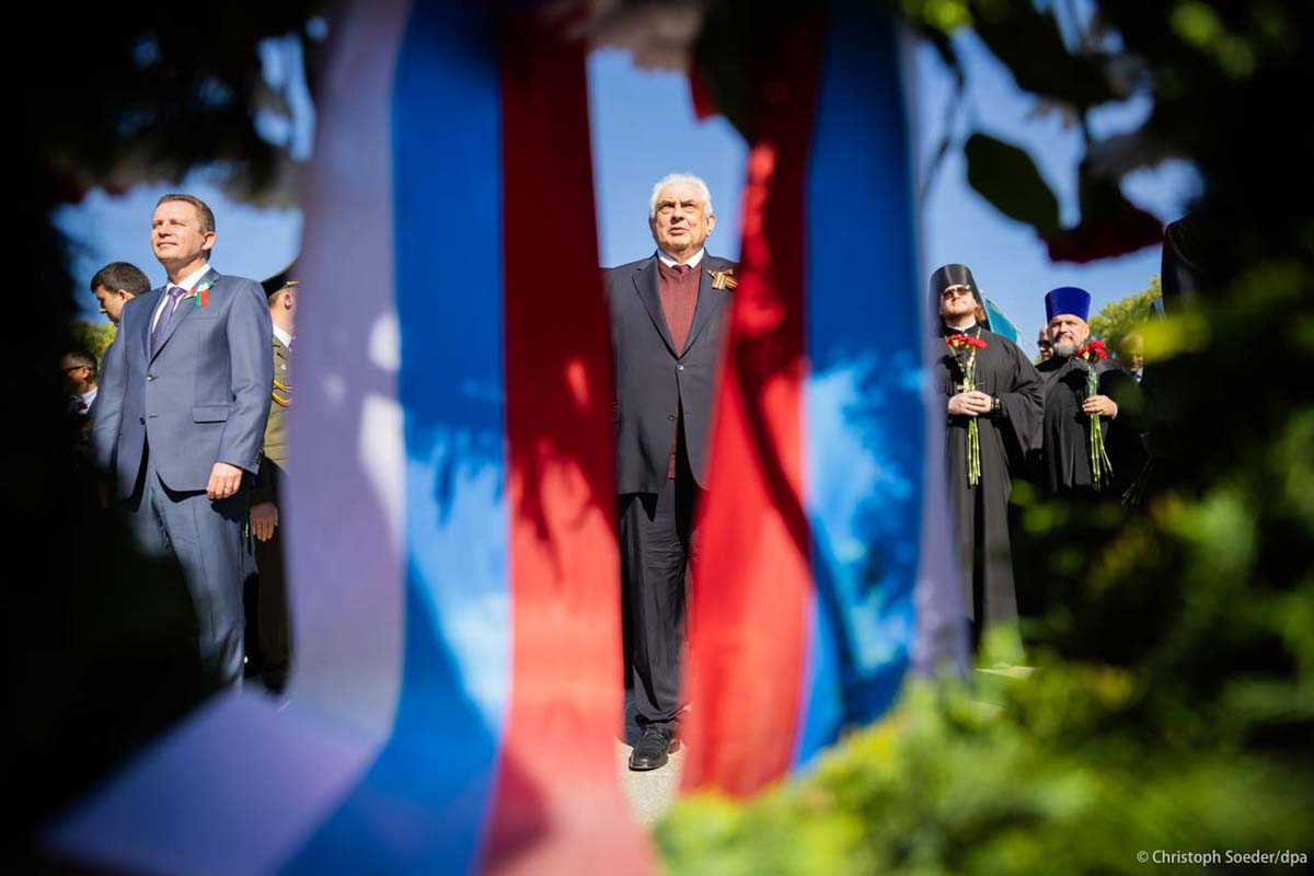 Victory day celebrations at the Soviet War Memorial at the military cemetery in the Treptower Park in Berlin with the Russian ambassador in Germany, Sergey Nechayev, and the Russian nationalist Night Wolves Motorcycle Club attending.