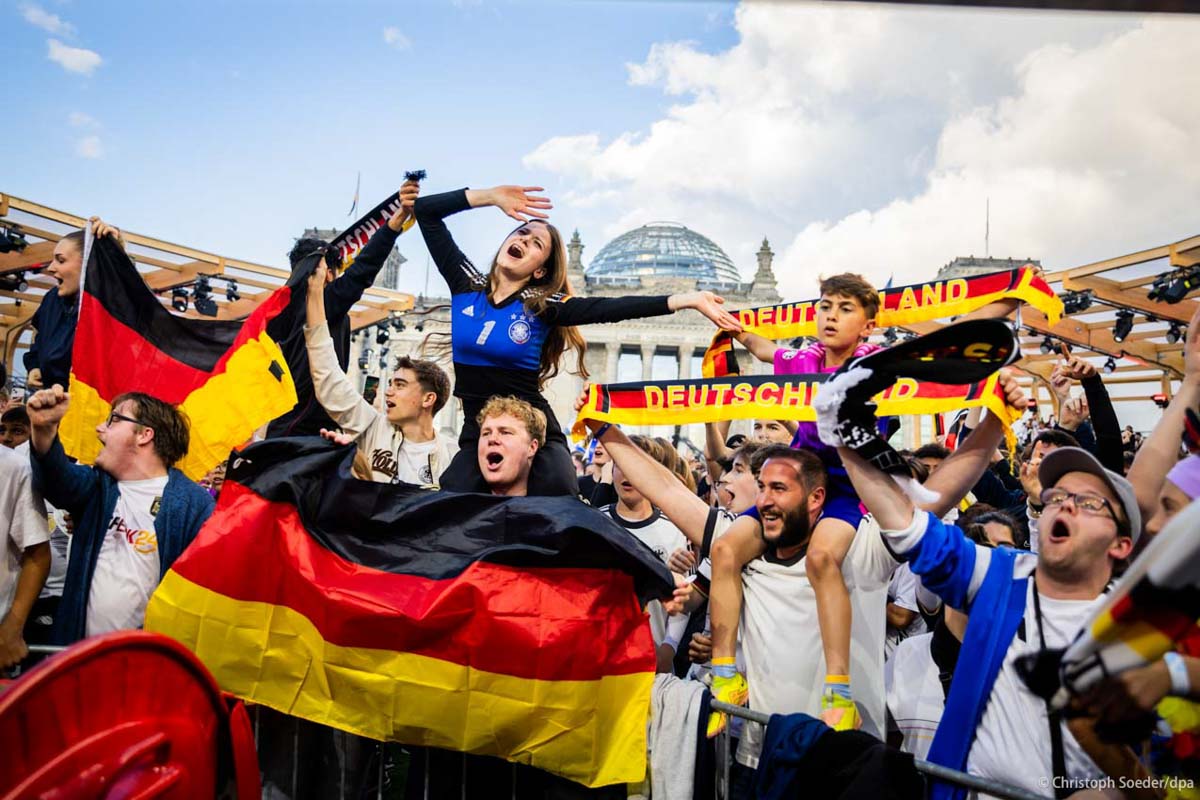 Soccer fans follow the of the Euro 2024 soccer tournament at the public viewing next to Berlin’s Brandenburg Gate and Reichstag Building.