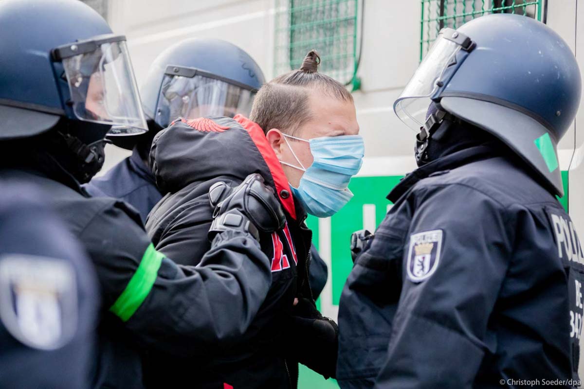 A man is arrested during a demonstration against German government's policy to battle the corona virus pandemic. Police offices have put masks on the man’s face, who refused to wear them.
