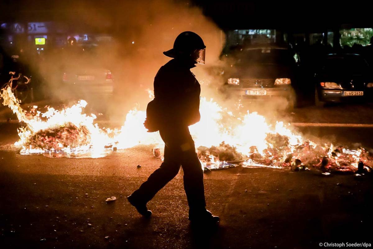 A police officer walks past a fire during 1st of May protests in Berlin