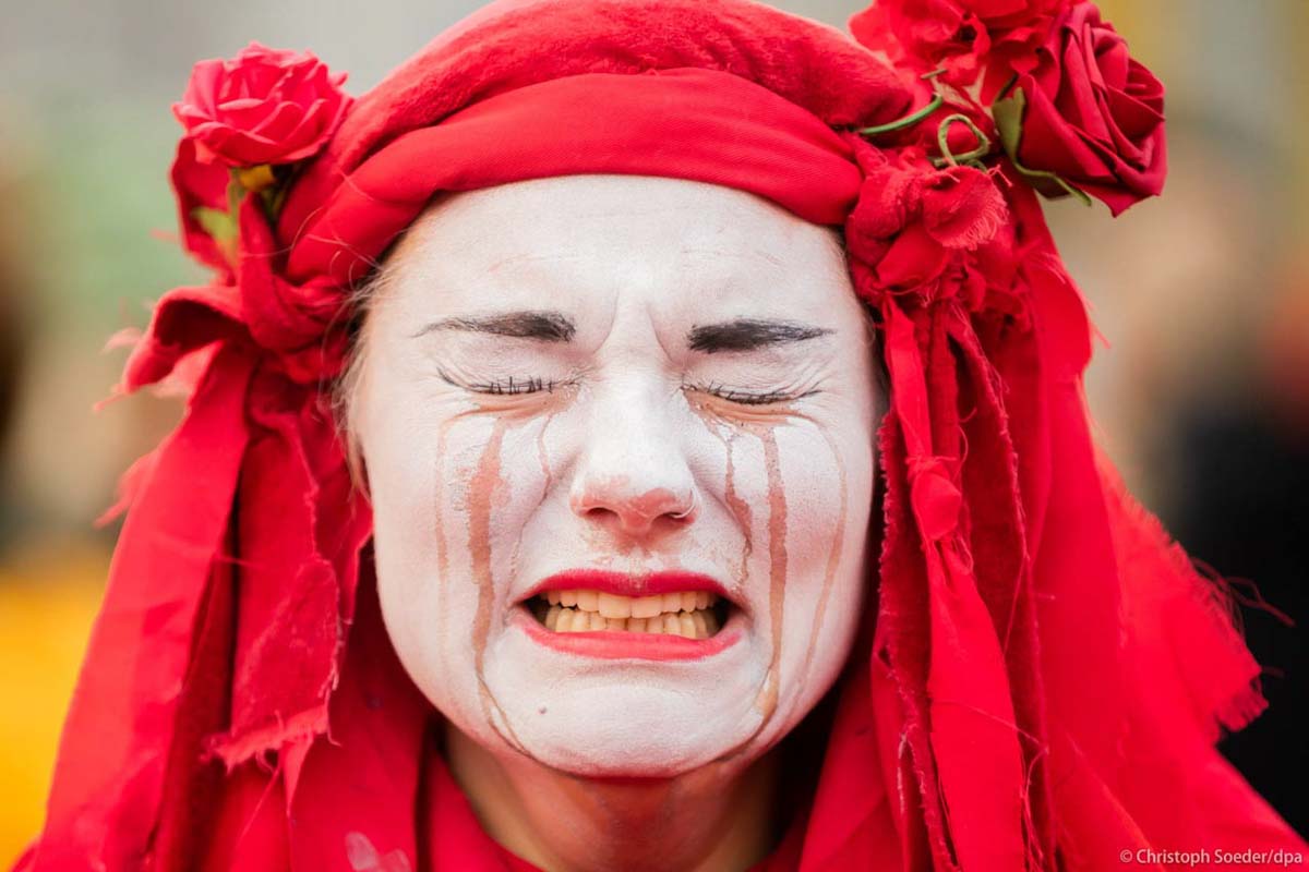 A extinction rebellion climate activist weeps during a protest outside COP26 U.N. Climate Summit in Glasgow