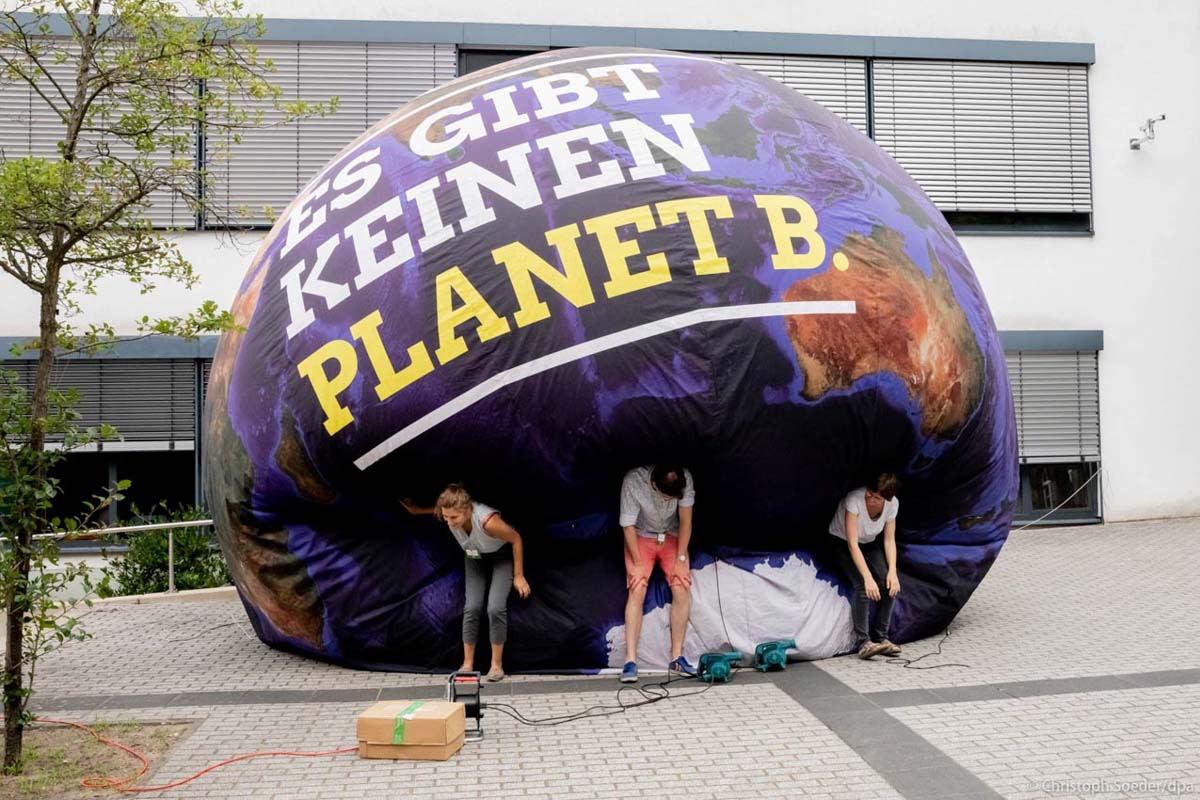 Members of the office of the Brandenburg Bündnis 90/Die Grünen party deflate an earth shaped ballon stating “There is no planet B.“ after a party conference of the green party Brandenburg in Potsdam.