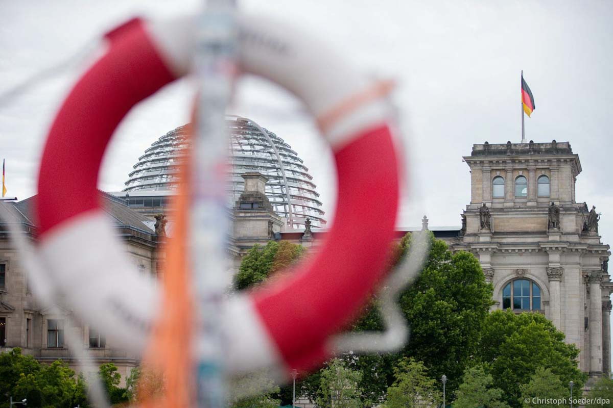 Reichstag building is seen through a safety buoy.
