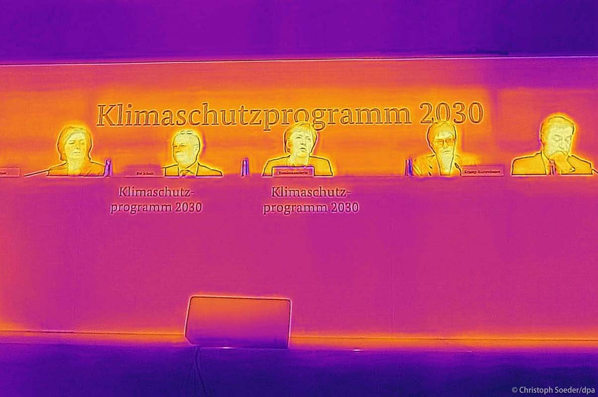 The thermal image of Prime Minister of Rhineland-Palatinate and temporary SPD-Head Malu Dreyer, Minister of Finance Olaf Scholz (SPD), Chancellor Angela Merkel (CDU), German Federal Minister of Defense Annegret CDU-Head Kramp-Karrenbauer, and Prime Minister of Bavaria and CSU-Head Markus Söder presenting the government’s climate protection program.