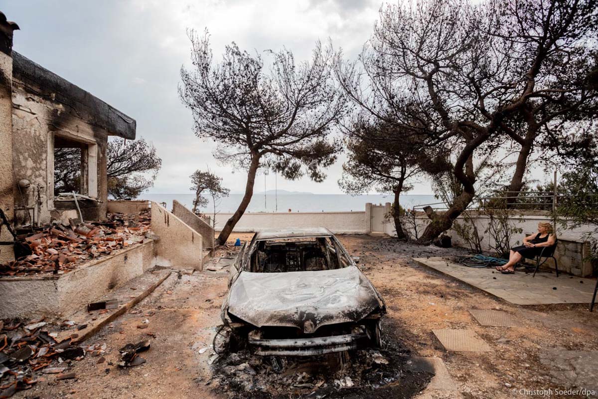 Asimina Psaltira sits in front of her burnt house in Mati in Greece. Psaltira fled from the flames into the sea, where she stayed for five hours, while the fire waged over the coastal area 30 km outside of Athens.